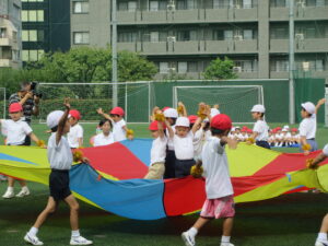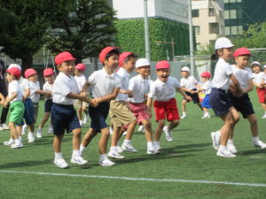 10月12日(日)本日は雨も上がり、中高下グラウンドにて運動会を行いました。年少組は可愛らしい忍者に変身し、元気いっぱいの踊りを披露しました。年長組は仲間と力を合わせて取り組んだパラバルーン。息を合わせて色々な技を行い、心をひとつにして取り組む姿に成長を感じました。リレーでは最後まで一生懸命走る子供たちの姿が印象的で、仲間を応援する声にも温かい気持ちがあふれていました。子どもたちの頑張りや優しさがたくさん見られた、運動会。応援に来てくださいました皆さまの温かなご声援とご協力に、心より感謝申し上げます。
